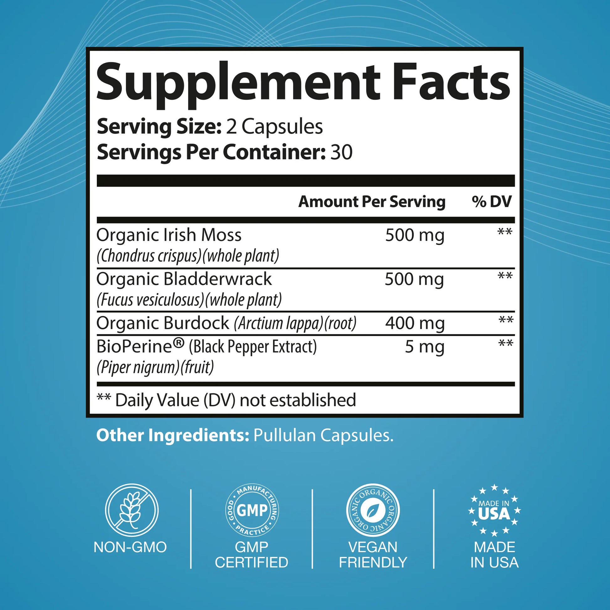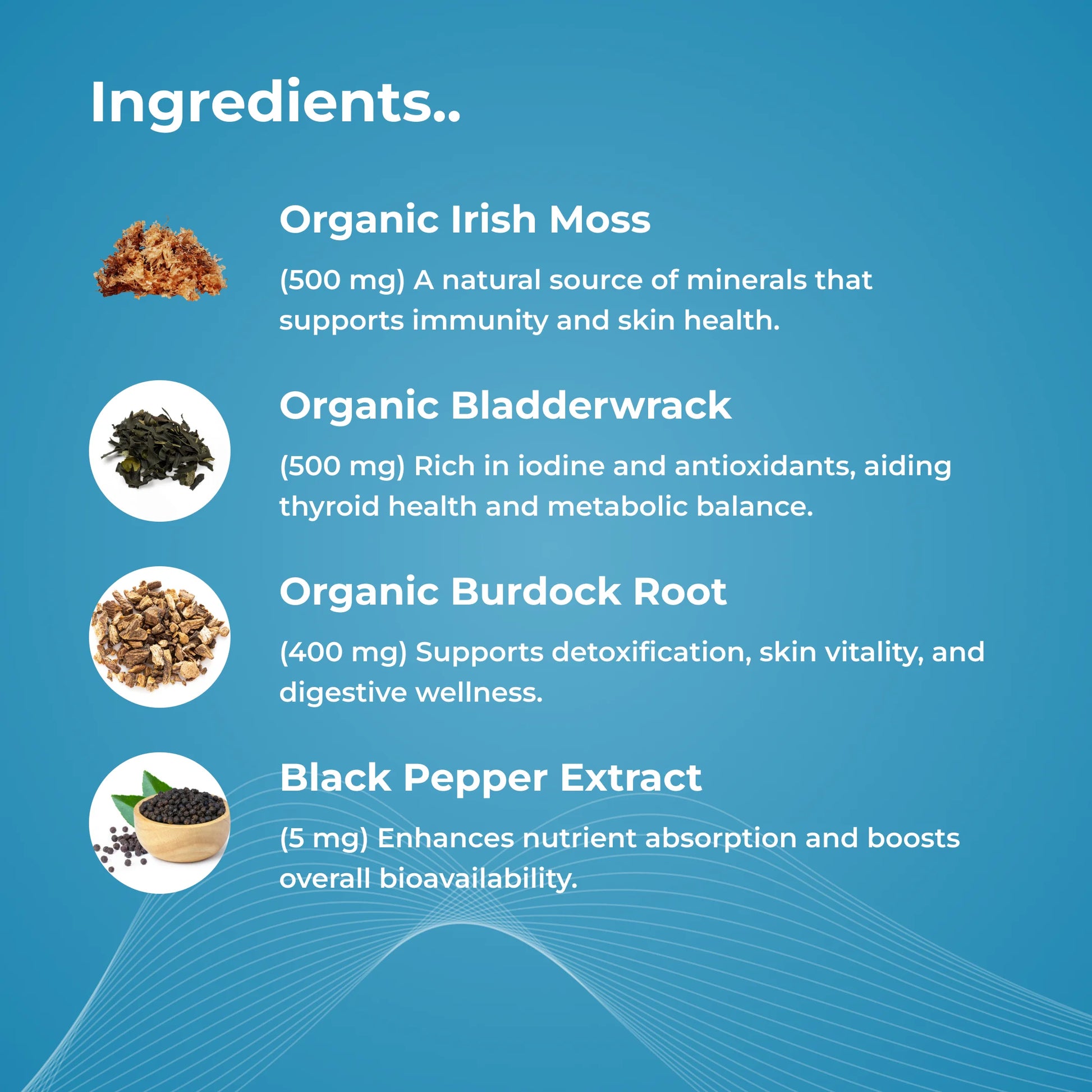 It combines organic sea moss, bladderwrack, and burdock root with BioPerine® for maximum absorption.