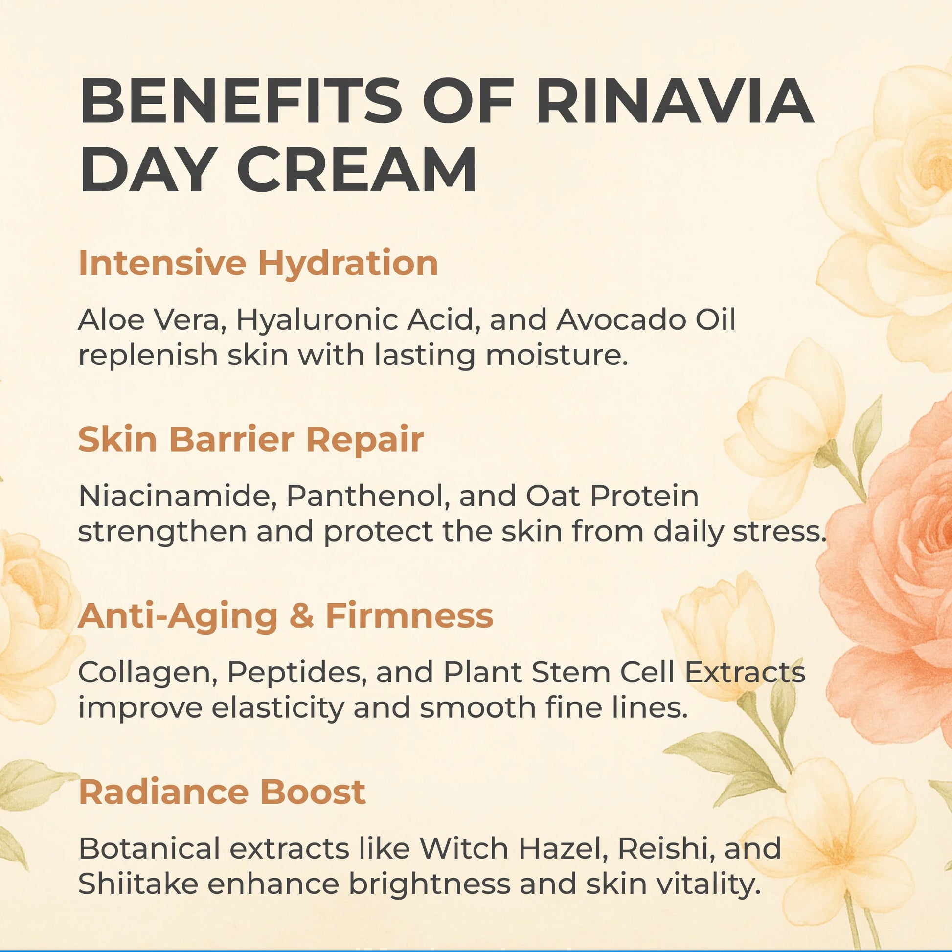 Rinavia Skin Renewing Day Cream is expertly crafted to deeply hydrate, restore, and protect your skin throughout the day. Powered by Shea Butter, Hyaluronic Acid, Collagen, and botanical extracts, this formula strengthens the natural skin barrier while boosting elasticity and radiance.